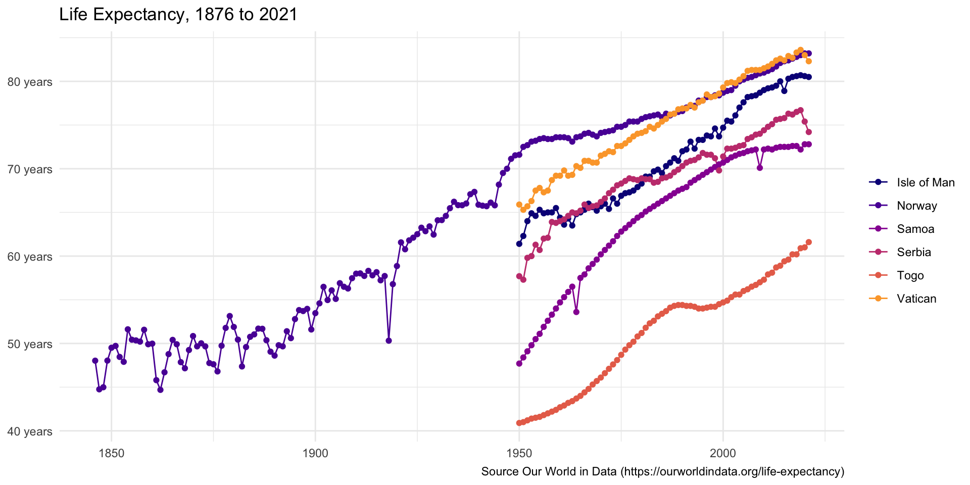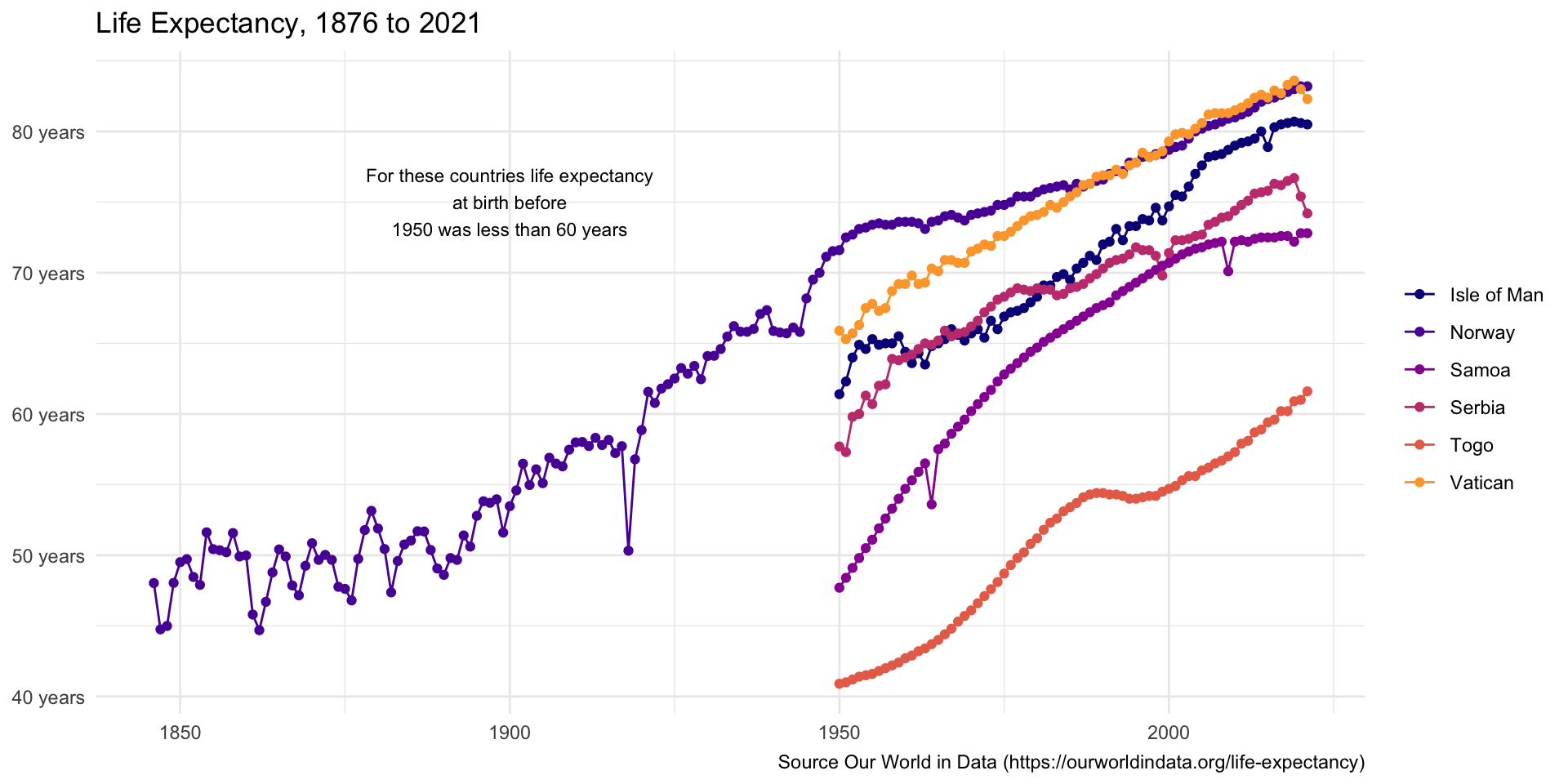 labs(x = NULL, y = NULL, color = NULL, title = "Life Expectancy, 1876 to 2021", caption = "Source Our World in Data (https://ourworldindata.org/life-expectancy)") +